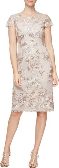 Embroidered flowers and leaves add an air of romance to a classic sheath designed with scalloped cap sleeves and hint of shimmering sequins.