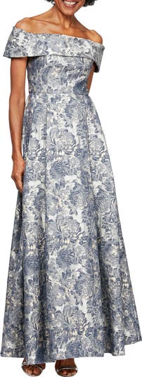 Feel almost regal in this shimmering floral brocade gown pairing a fold-over off-the-shoulder bodice with a full, floor sweeping skirt.