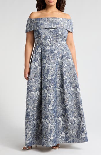 The romance of a bygone era starts the style story for this elegant ballgown textured in shimmering blooms and cut to show off your shoulders.