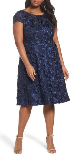 Lustrous, sequin-filled blossoms upon a lace backdrop make you shine from every angle in this flared cocktail dress that's ready for all those RSVPS.