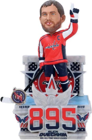 Alex Ovechkin (Washington Capitals) NHL All Time Goals Leader Moment Bobblehead. Portrays Ovechkin posing and wearing his gameday uniform, ready to make the play of the game. Thematic marble-textured backdrop and base with team-colored accents that will look great in your collection. Team logo displays on both sides of backdrop, so your team pride is on display from all angles. Ice-textured top of base. All time goals leader logo display on top of base, letting everyone know Ovi’s got the record on lock. “895” text display on front of base, showing off the new mark for goal-scoring greatness. “NHL ALL-TIME GOALS LEADER” and date text displays on front of base, so you never forget this moment. Team logo displays on top and front of base, in case there were any doubts where your allegiances lie. Front name display so everyone knows who the face of your franchise in.
