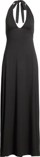 A plunging halter neckline brings an alluring look to this skin-baring midi dress fashioned in an open-back silhouette with adjustable ties.