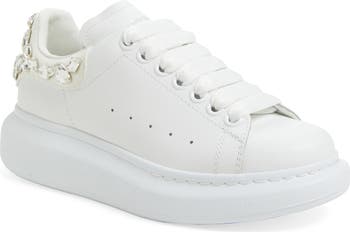 Chunky mixed-cut crystals sparkle at the counter of this calfskin-leather sneaker bumped up on the brand's signature flared sole.