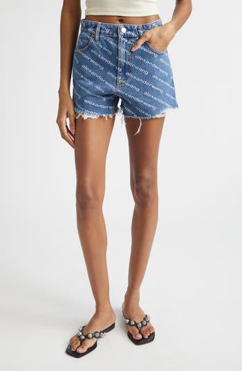 Repeating logos stand out against the deep indigo wash of nonstretch-denim cutoffs in a vintage-inspired, high-rise fit with extremely frayed hems.