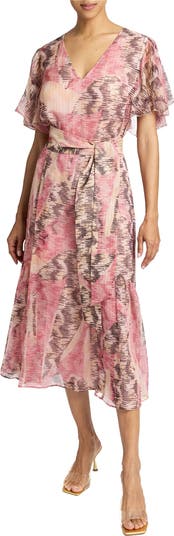 - Ruffled Midi Dress in Abstract Printed Silk Crinkle Chiffon with Subtle Metallic Stripes