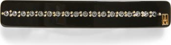 A slender, glossy barrette is accented with a sparkling line of Swarovski crystals for a delicate, Art Deco-inspired addition to any style.