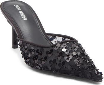 Metallic beads and lustrous sequins illuminate the mesh upper of a glam mule featuring a snip toe and tapered heel for poised and walkable balance.