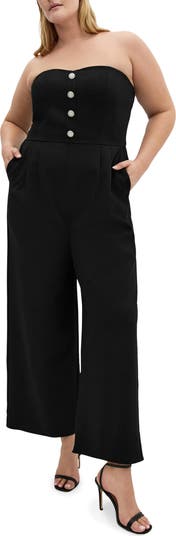 Show off your shoulders in this stylish wide-leg jumpsuit designed with sparkling buttons at the bodice and a sweetheart neck.