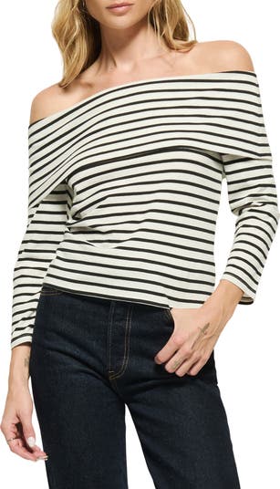 An oversized neckline fold creates dimension on this lively striped top made to show off your shoulders.