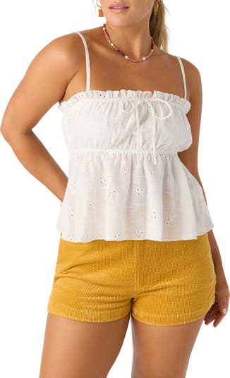 Charm all-day long in this breezy eyelet-adorned cami sweetened with a bow at the neckline and a charming babydoll silhouette.