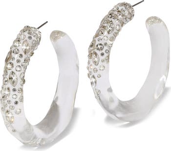 Hand-sculpted Lucite hoop earrings feature a watery silhouette with a scattering of custom-cut inlaid crystals lending luxurious sparkle.