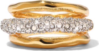 Bands of liquid metalwork plated in 14-karat gold and pavé crystals stack to create negative space and illusion in this stunning ring.