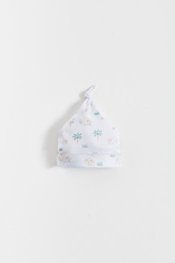 Pima cotton knot beanie featuring an adorable pattern of palm trees and elephants throughout. Adorned with our embroidered logo on the front for an extra touch of sweetness.