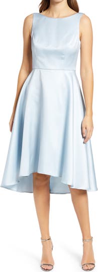A perfectly flared skirt with a high/low hemline defines this lustrous cocktail dress. A bateau neckline, sleek princess seams and a scooped back make this satin design a perfect choice for weddings and evening events alike.