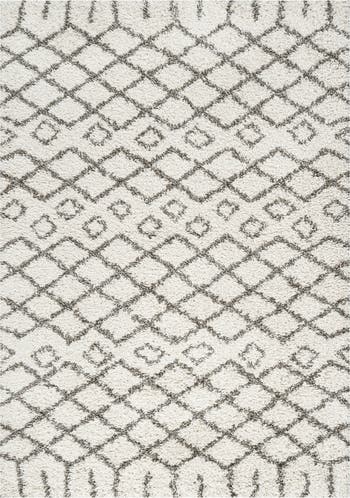 Inspired by vintage Beni Ourain rugs, our soft and fluffy shag yarns make it easy to go barefoot. Our classic Moroccan pattern has a navy diamond trellis on a field of ivory. Anchor your Bohemian space; add softness to a bedroom, living room, or cozy reading nook; this fluffy shag rug has timeless style.