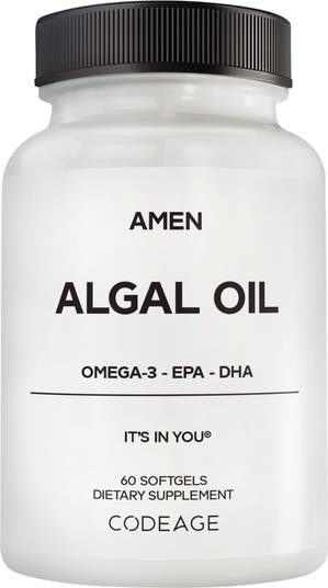 - Amen Algal Oil vegan omega 3 capsule supplement offers DHA (Docosahexaenoic Acid) and EPA (Eicosapentaenoic Acid), two long-chain omega-3 fatty acids commonly found in marine sources such as algae.