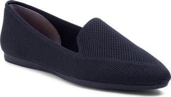 A breathable knit upper gives a flexible fit and lightweight feel to a flat outfitted with foam-cushioned support.