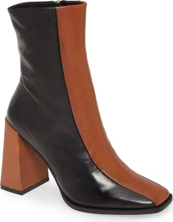 Bold color blocking elevates the statement-making style of a mod-inspired bootie styled with a squared-off toe and striking flared heel.