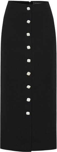 The Button Front Midi Pencil Skirt in black combines button-front styling. It moves comfortably and pairs easily with both casual and polished tops. It pairs easily with simple knits, shirts, or blouses for both casual and polished dressing.