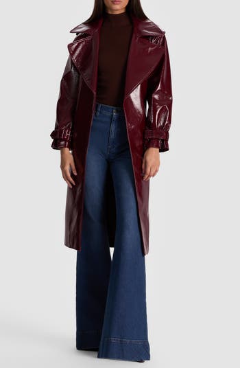 Support your fashion mission with a classically cut trench turned out in a high-shine faux leather fabrication and painted in a wine-soaked shade.