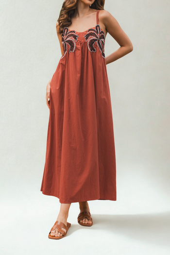Your next "go to" dress with a beautiful tropical embroidery detail. Casually cool you will love the embroidered detail and relaxed fit wherever you wear this dress!