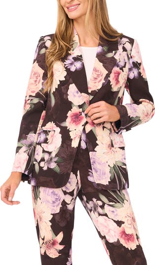 Peaked lapels and pretty petals polish a blossom-tossed blazer that works for fun or fancy looks.