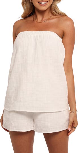 Sun your shoulders in this billowy strapless romper crafted from lightweight, gauzy cotton with a faux-layered design.