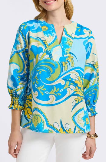 Billowy three-quarter sleeves with smocked cuffs frame this crisp cotton popover top cut in a relaxed fit and covered in a whimsical floral print.