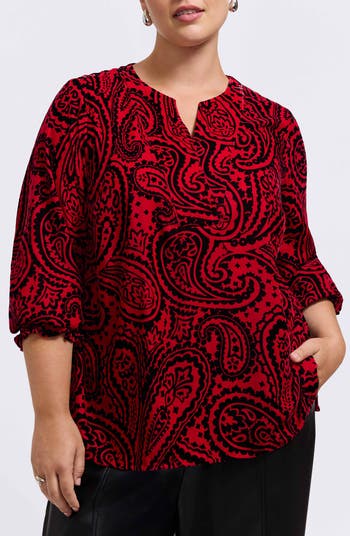 Voluminous longs sleeves with smocked cuffs frame this chic popover top cut in a relaxed fit and covered in velvet paisley swirls.