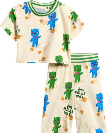 Greeting Earthlings, we come in comfort: this out-of-this-world organic-cotton set pairs a relaxed T-shirt with wide-leg pants, both patterned in galaxy-exploring aliens.