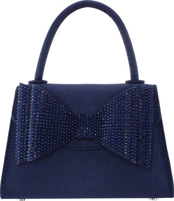 A voluminous, jewel-encrusted bow underscores the glam appeal of a soirée-ready bag fitted with a rolled top handle and optional chain strap for hands-free wear.