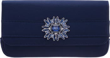 A faceted jewel ornament underscores the opulent appeal of an elegant satin clutch featuring an optional chain strap for hands-free wear.