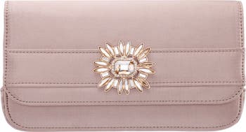 A faceted jewel ornament underscores the opulent appeal of an elegant satin clutch featuring an optional chain strap for hands-free wear.