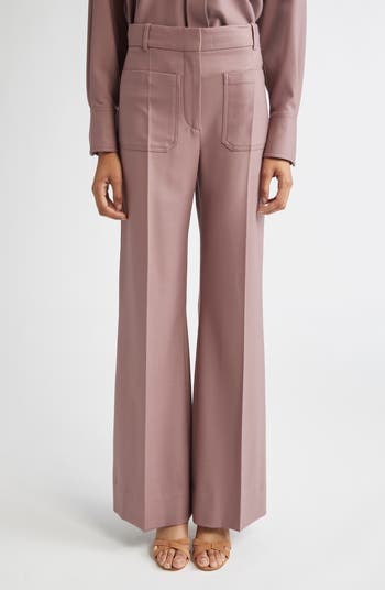 Victoria Beckham refreshes these signature trousers for the season in a mauve-hued, wool-enriched fabrication that holds the sharp creases in the wide-cut legs.