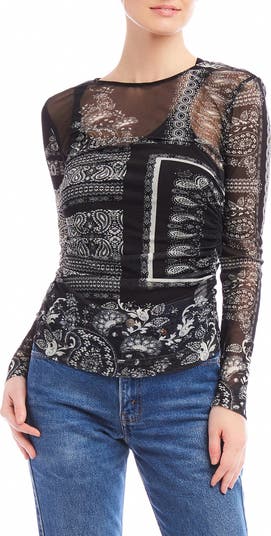 Patchwork paisley brings charming Western style to a long-sleeve top cut from lightweight, stretchy mesh with side ruching for a figure-skimming fit.