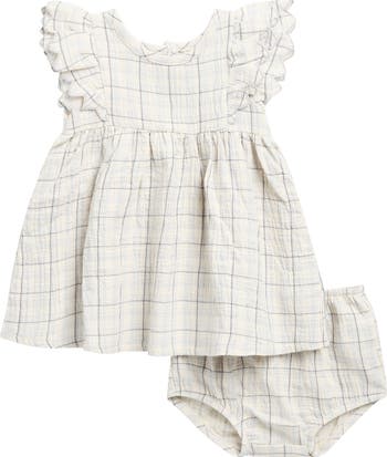 Keep your sweet pea feeling breezy in this organic-cotton-gauze dress featuring flutter sleeves, adorable ruffles and matching bloomers.