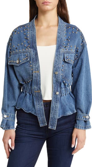A jean jacket with some twists—this one features high-shine studs, belted cuffs and a frilled peplum.