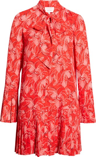 A pussybow tie tops this button-front chiffon shirtdress featuring a dropped waist and a pleated skirt that moves with each step you take.
