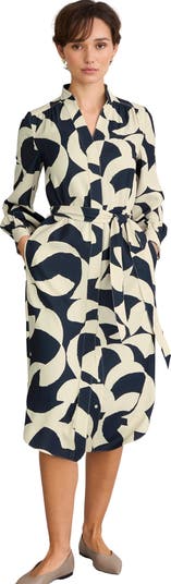 A belted shirt dress that skims the body, offering a fluid drape, mandarin collar, and graceful midi length for confident office to evening style.