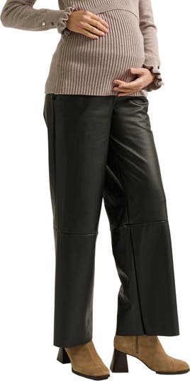 Faux leather maternity pants with ultra-stretch fabric, soft fleece-like lining and elastic underbelly waistband for comfort all pregnancy long.