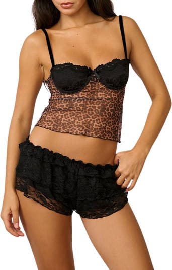 Flowery lace and leopard-print satin expertly unite sweet and sultry in this camisole finished with scalloped edging and a back cutout.