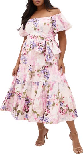 A romantic floral print defines this charming midi dress styled with a square neckline and puff sleeves that can be worn on or off the shoulder. Princess seams shape the bodice, while a waist tie defines the silhouette. A tiered skirt adds soft movement to the dreamy look.