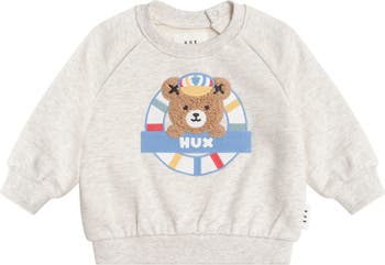 All aboard! This vintage train station style sweatshirt in almond marle is made from fluffy organic terry cotton and features a retro Huxbear embroidery on the front.