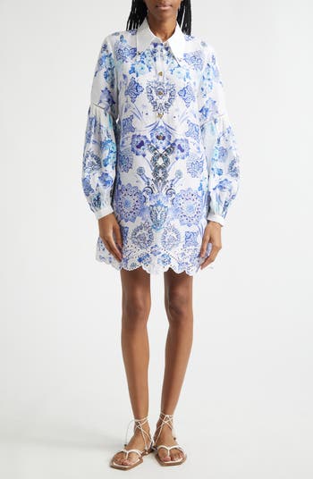Lattice insets at the billowy blouson sleeves lend airy charm to this relaxed-fit shirtdress cut from a linen-silk blend patterned with a vibrant limited-edition print inspired by Turkish bazaars. Dainty heart-shaped buttons complete the look.
