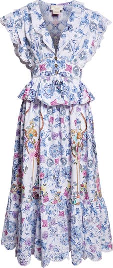 Lattice insets frame the Empire waist, adding to the airy charm of this midi dress cut from organic cotton and patterned with a vibrant limited-edition print inspired by Turkish bazaars. Dainty heart-shaped buttons and a softly flared peplum complete the look.