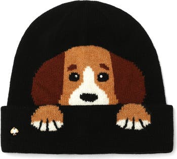 You'll look forward to every chilly day so you can wear this cozy wool-knit beanie boasting an adorable puppy peeping over the folded cuff.