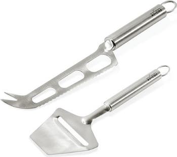 Shred, slice and dice your cheese with ease using these stainless-steel tools that are stylish enough to display with your favorite charcuterie board. The plane glides smoothly over the block of cheese to create wide strips, while the cutout knife works on both soft and hard cheeses with a double-prong point for jabbing cubes, fruit or meat.