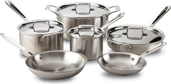 Equip your kitchen in professional fashion with a matching ten-piece set including 8" and 10" fry pans, 1 1/2-quart and 3-quart sauce pans, a 3-quart sauté pan and an 8-quart stockpot. All pieces are constructed with five bonded layers of stainless steel and conductive aluminum, each of which contributes to superlative heating performance on traditional and induction cooktops alike. Stainless cores improve stability, preventing warping and virtually eliminating hot spots, while magnetic exteriors make the pans compatible with hob surfaces. The 18/10 stainless steel interiors are hygienic and safe, with interior starburst finishing to improve nonstick performance. Tight-locking lids, specially designed to retain moisture, are safe for use in the oven or on the stovetop; and convenient rolled lips make for easy pouring. Comfortably oversized handles finish off this collection of kitchen favorites.
