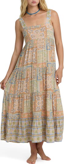 A patchwork of flowery prints enlivens this breezy cotton sundress made with comfortable back smocking and finished with a flouncy tiered skirt.