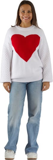 - Large red heart detail, textured knit sleeves, and a cozy crew neckline